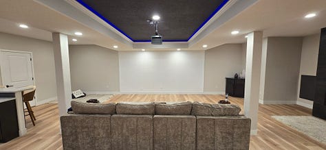 Finalize speaker wire hiding early - If you’re doing surround sound (which you should), the wiring plan must be finalized before the drywall goes up and they start insulating the ceiling. I definitely messed this one up, but I’ll find a solution to use a lightweight amp up there with low latency.