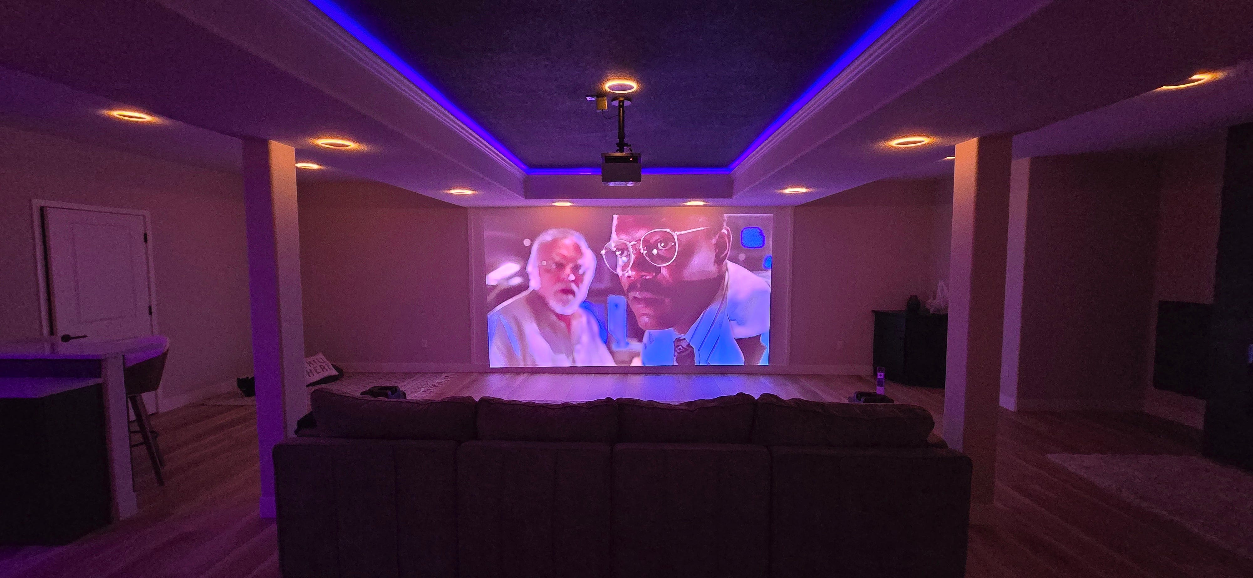 Consider buying this awesome projector - Valerion VisionMaster Pro 2 mounted on the ceiling upside down around 12 ft from the wall (used ChatGPT to suggest the measurement and size). It gives me a 170” screen. Not only do I love the image quality, but the projector itself looks like a giant heat sink.