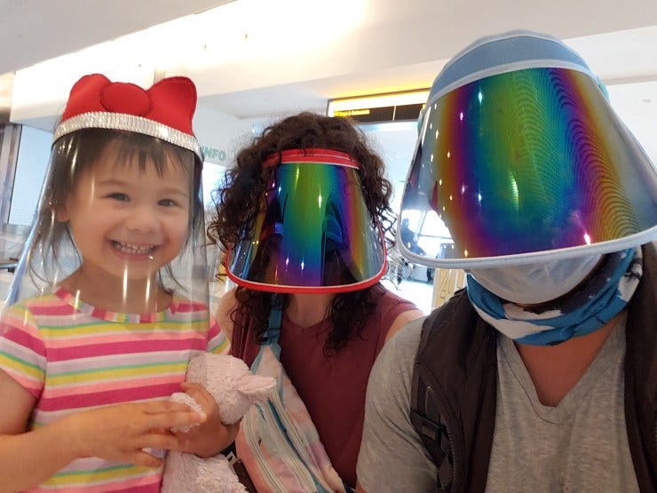 Get her used to wearing a mask – We had an awesome face shield my Mom made, but in retrospect, it would have been great to have her wear a mask. With a 4 hour flight, it was literally 6 hours of flying