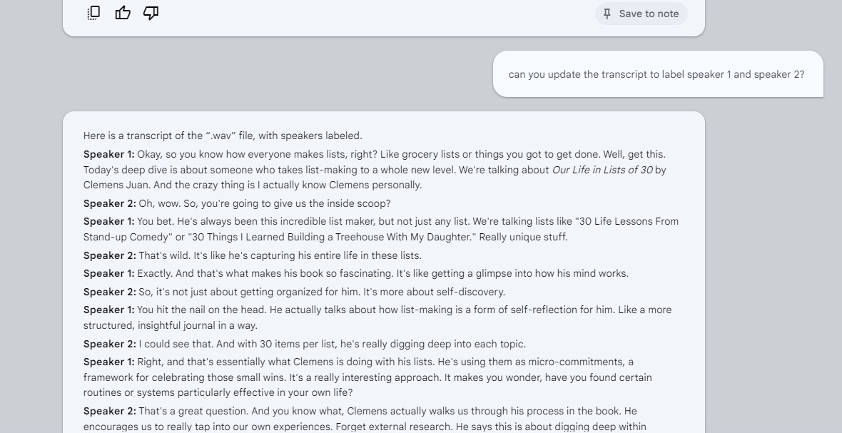 To add the speaker distinctions, I just asked it to label the speakers and it worked perfectly: